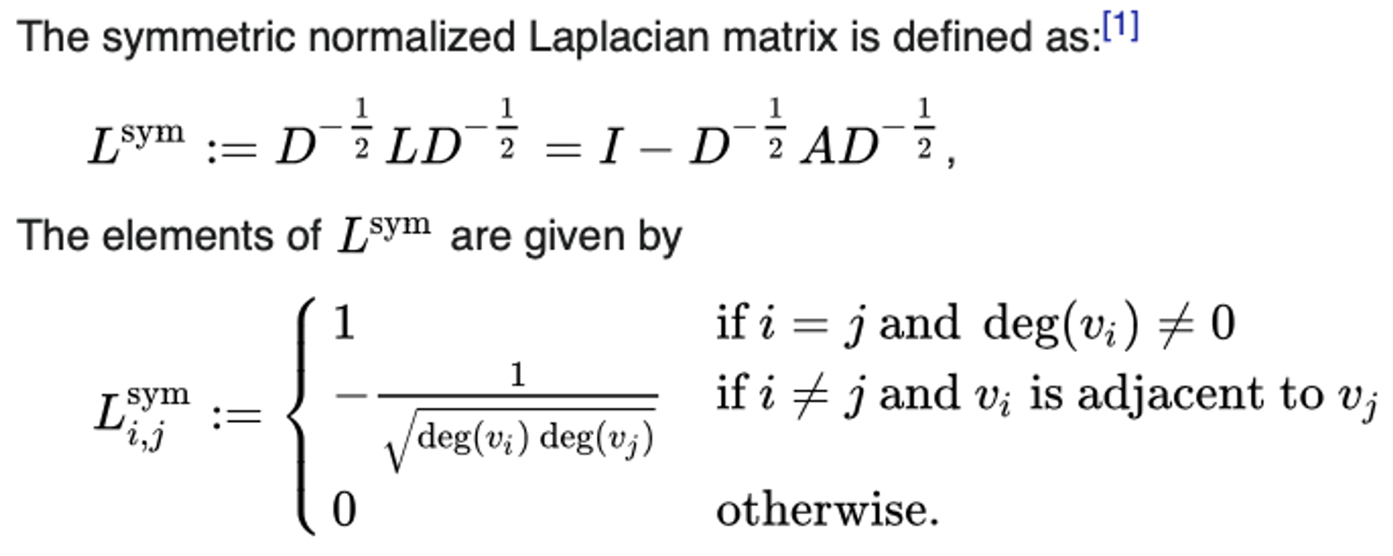 Symmetric normalized laplacian matrix → 말 그대로 라플라시안 행렬을 정규화한 것. 차수 정보(degree)가 모두 1로 통일